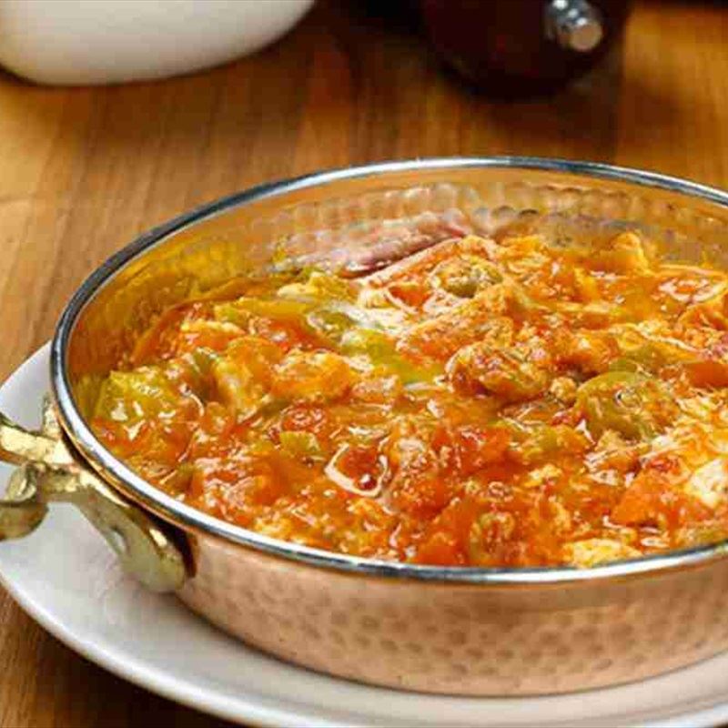 Omschrijving: Traditioneel Turks ontbijtgerecht van eieren en tomaat, zacht gebakken met kruiden.